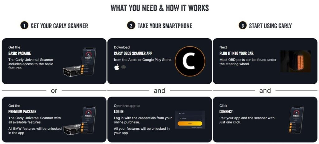 To embark on your journey with MyCarly, you first need to secure the Carly Universal Scanner. The basic package provides access to fundamental features, ensuring that you have a robust diagnostic tool at your fingertips. However, for those looking to unlock the full potential of the Carly Scanner, the premium package is the way to go. By opting for the premium package, you not only receive the Carly Universal Scanner but also gain access to all available features for your specific vehicle. What’s more, these features are activated immediately after purchase, offering an unparalleled diagnostic experience.